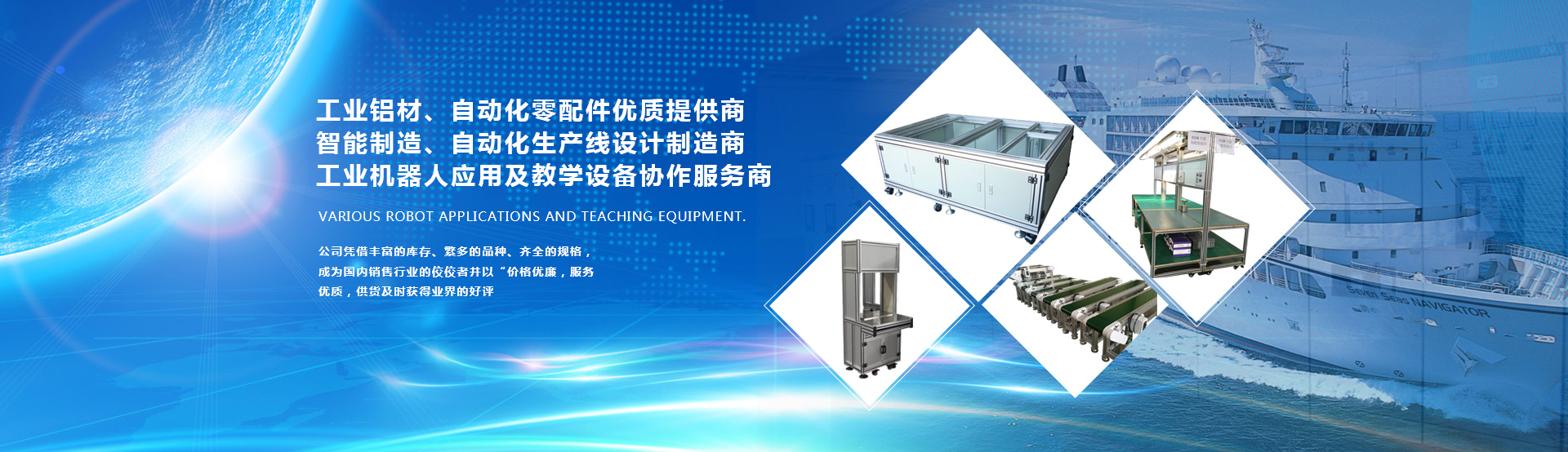 各種機(jī)器人應(yīng)用及教學(xué)設(shè)備。為工業(yè)生產(chǎn)及工業(yè)自動化提供一站式配套服務(wù),我們的產(chǎn)品有:1、國標(biāo),歐標(biāo)全系列工業(yè)鋁型材,